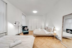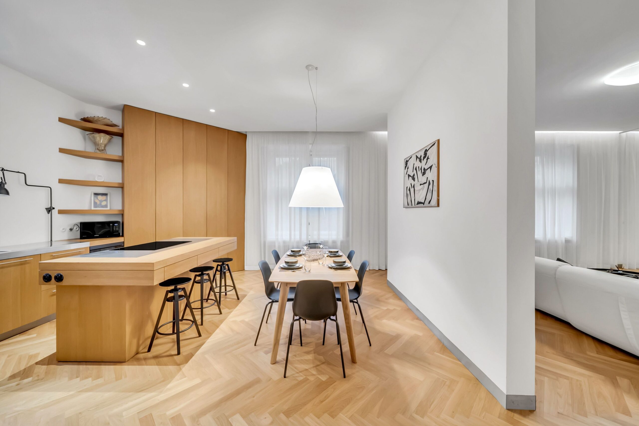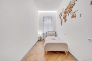 Byt sa nachádza v secesnom dome z roku 1903 a prešiel kompletnou rekonštrukciou pod vedením architekta Iľju Skočeka. Každý zásah bol realizovaný s dôrazom na zachovanie autenticity a zároveň na vytvorenie nadčasového interiéru. Pôvodné drevené parkety, vysoké stropy a remeselné detaily zostávajú dominantou priestoru, zatiaľ čo moderné prvky prirodzene dopĺňajú celkový charakter bývania. Celková výmera 155 m² poskytuje veľkorysý priestor bez kompromisov.